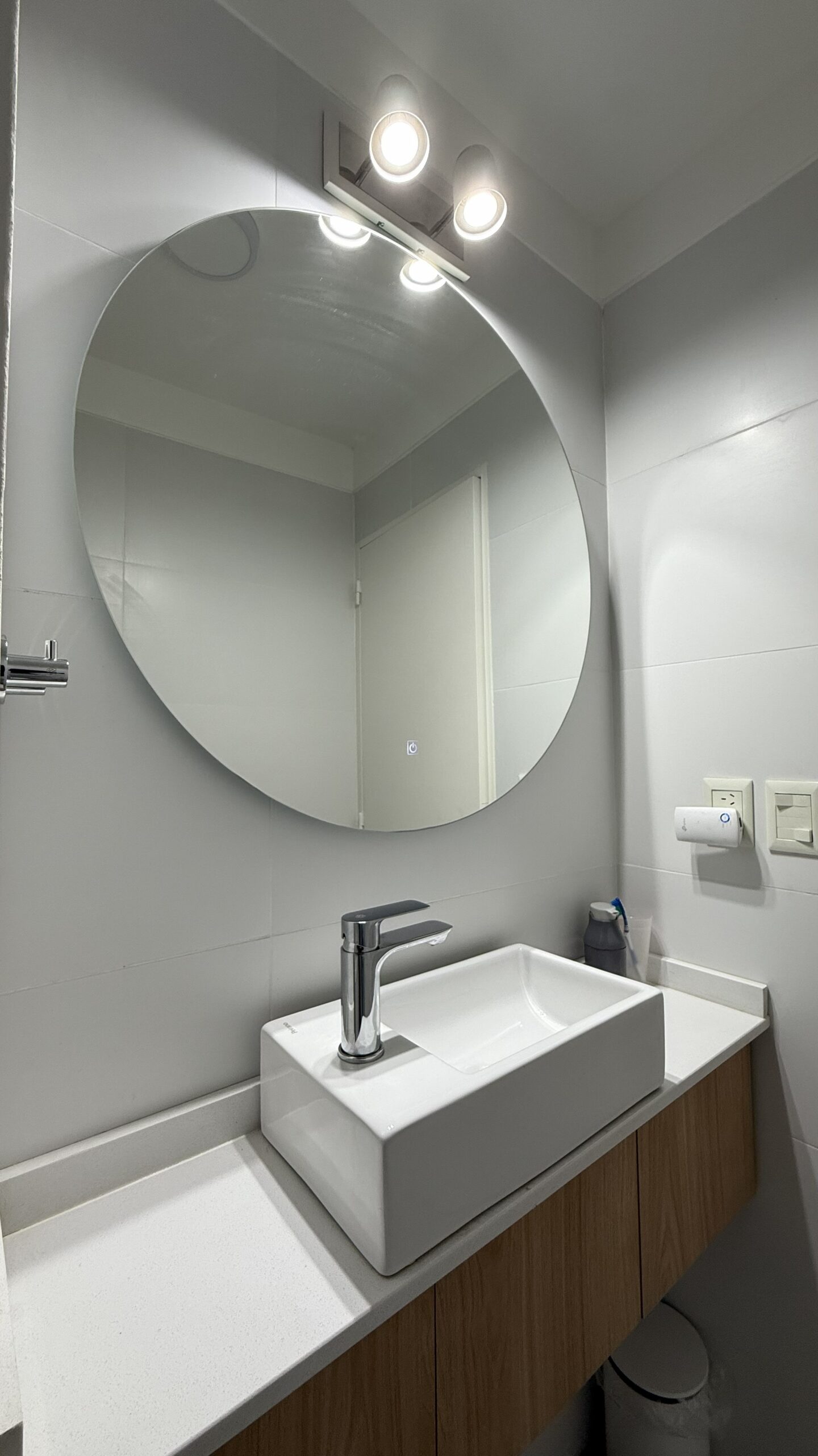 Un espejo circular retroiluminado con luces LED se convierte en el punto focal del diseño, generando una atmósfera moderna y sofisticada.