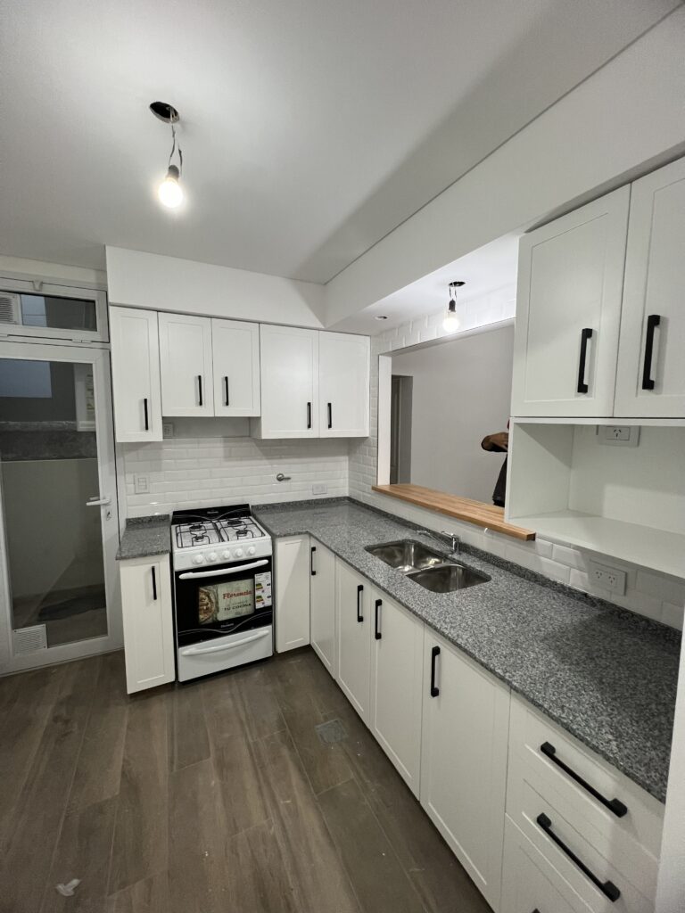 La intervención incluyó la renovación de cocina, baño y dormitorio, incorporando un diseño simple y materiales contemporáneos en revestimientos y solados, que aportan modernidad y coherencia visual al conjunto.
