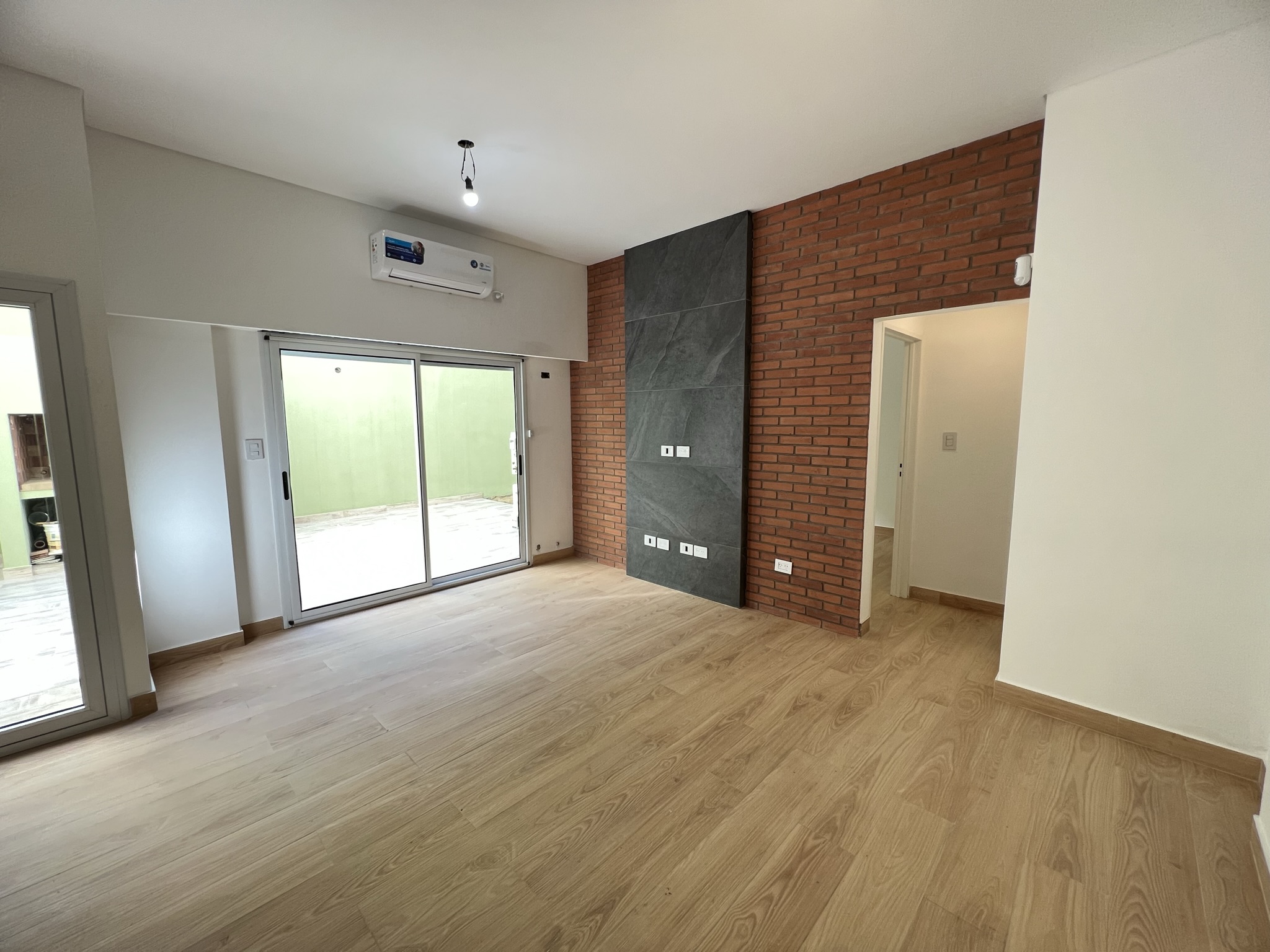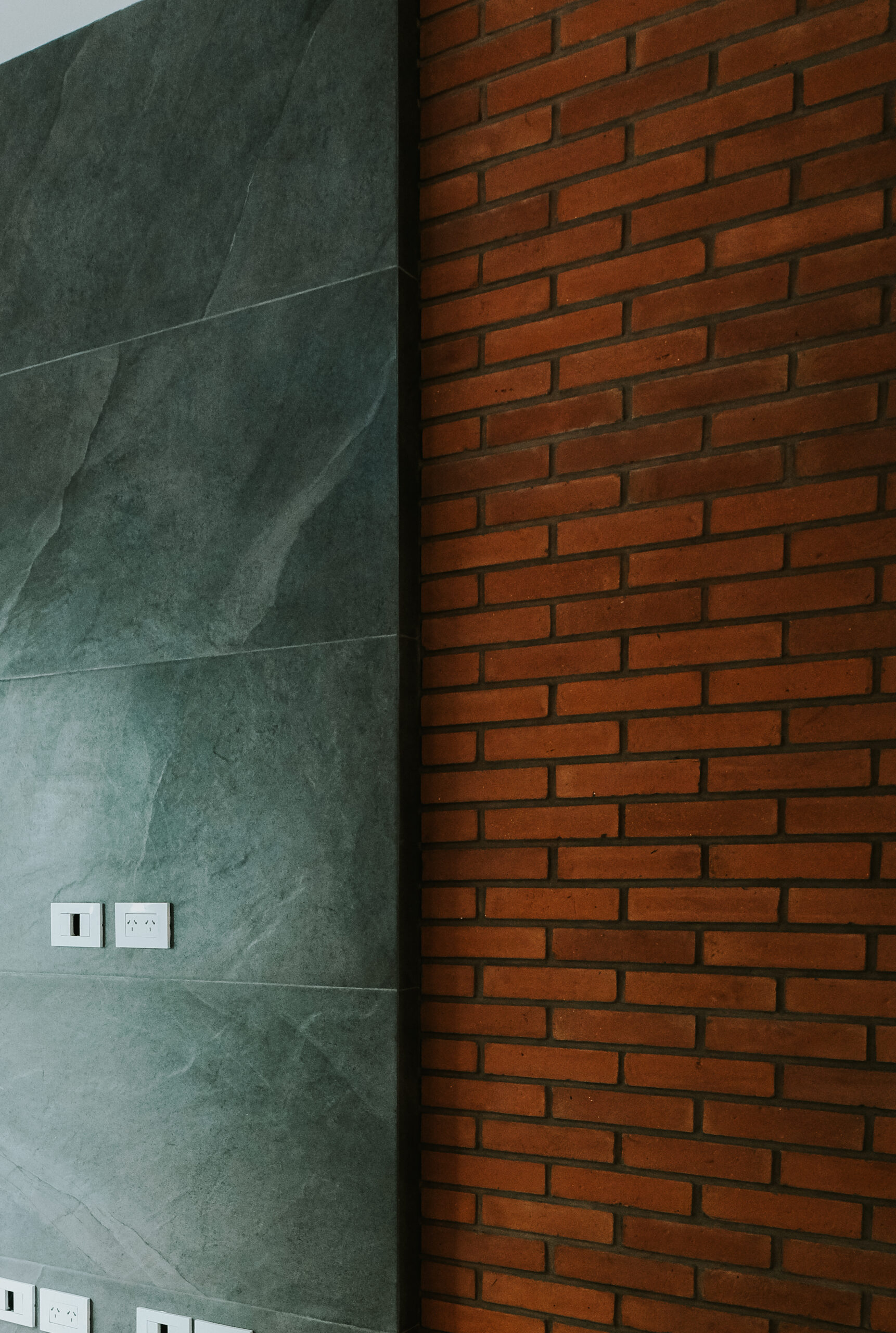 El diseño incorpora un muro de ladrillo visto combinado con un revestimiento de mármol, conformando el punto focal de la vivienda y reflejando la personalidad y preferencias del cliente.