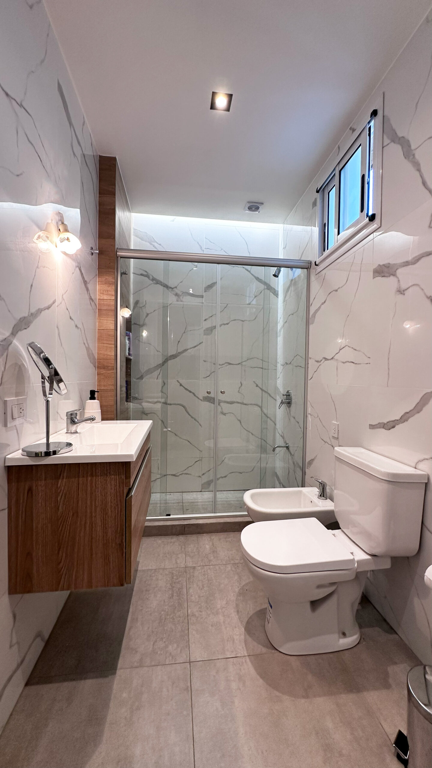 En el baño se incorporaron revestimientos modernos que aportan textura y frescura, consolidando una estética contemporánea y armónica con el resto de la vivienda.